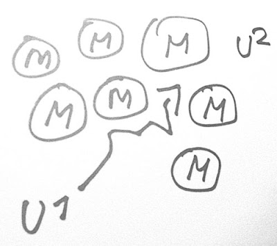 Dagens diagram skiljer sig från de föregående (här och här) på så sätt att vi har tillfört två aktörer i leken; A och B, som med sina individuella målsättningar (U1) konkurrerar om precis samma mål (U2). A resp. B skulle kunna vara två löpare som deltar i en tävling. Bådas yttersta mål (U2) är att vinna tävlingen.